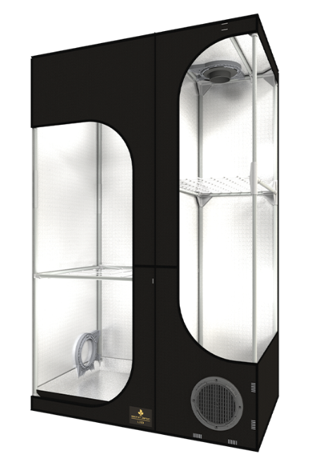The Secret Jardin Lodge grow tent uses the same technology as Dark Street and features 3 grow spaces. The left side, suits plants measuring 50 cm to 150cm tall. The two spaces on the right, suits plants less than 80cm tall. It features ducting flanges (DF16) for managing intake/exhaust. With the addition of a light baffle (DF16LB) between the spaces, a single extractor will do all three spaces.